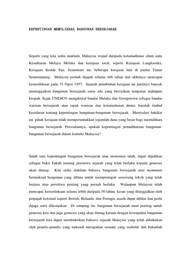 Contoh karangan respons terbuka Kepentingan Pemuliharaan dan Pemeliharaan Bangunan Bersejarah Langkau ke kandungan utama Carian. Kepentingan Fungsi Bangunan Bersejarah Malaysia dan Keadaan Pada Masa Kini. Kepentingan Memulihara Bangunan Bersejarah.