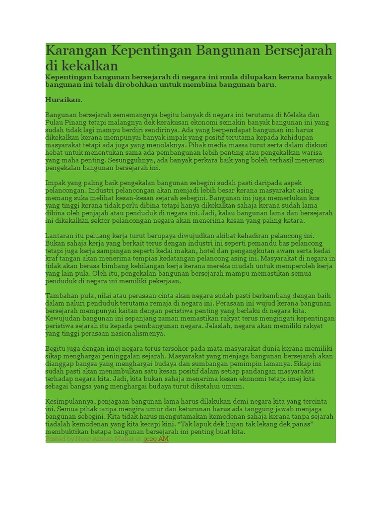 Dicatat oleh Cikgu Hasanah di. Dalam konteks ini bangunan bersejarah perlu dikekalkan untuk menjadi tatapan dan penghayatan generasi muda. Saya menggunakan karangan yang saya tulis dan disemak oleh guru sekolah sebagai contoh karangan dalam blog ini.